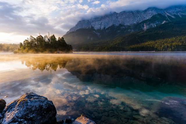 Das Glitzern in der Sonne verlockt, in den Eibsee einzutauchen. Nehmen Sie Ihre Badesachen mit: Schwimmen ist am Eibsee erlaubt und das Wasser hat sogar Trinkwasserqualität. Rund um den See finden Sie an vielen Stellen Zugang zum Wasser. Der Eibsee ist bis zu 32,5 m tief und misst bei einer Länge von bis zu 2.450 m an der breitesten Stelle 850 m. Im Sommer hat das Wasser erfrischende 20-22 °C.